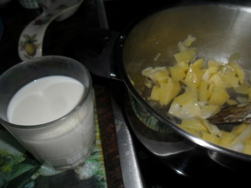 partir la patata a dados pequeños y cortar la parte blanca del puerro