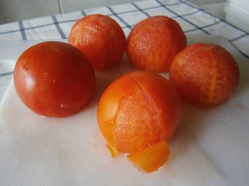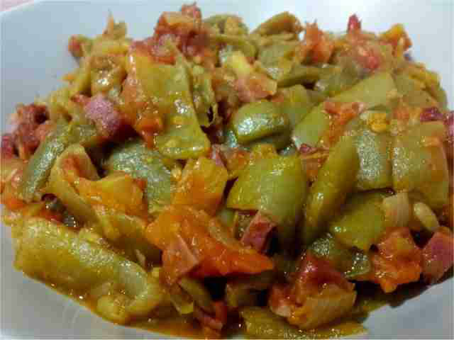 Limpiar cuidadosamente las judías, quitándoles las fibras duras de los laterales si las tuviera, cortar en tiras alargadas o en rombos. Pelar y picar la cebolla en juliana y los dientes de ajo. Escaldar los tomates, pelar y cortar en carré.