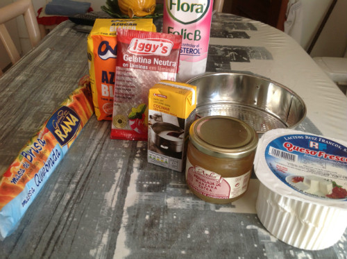 preparar todos los ingredientes, la masa quebrada se puede hacer casera con harina , mantequilla , azúcar y sal o comprarla echa , la venden fresca y congelada, el queso fresco una tarrina de medio kilo y mermelada se puede usar cualquiera, pero con la de manzana combina muy bien, las hojas de gelatina neutra