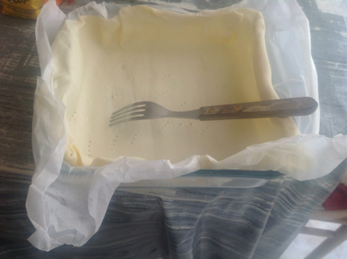 poner en el molde la masa sin quitar el papel, pinchar el fondo varias veces con un tenedor, encender el horno y precalentarlo 10 minutos a 200º, meter la masa y tenerla media hora, sacarla y dejar que enfrie