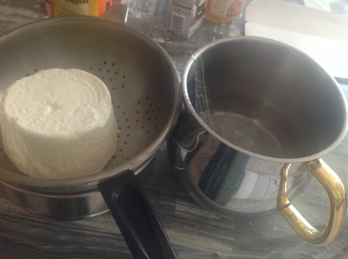 poner el queso fresco a escurrir y de mientras en un cazo con agua fria reblandecer las hojas de gelatina 5 minutos.En otro cazo mezclar la nata y la leche, calentarlo a fuego lento 10 minutos, después, incorporar las gelatinas de una en una hasta que estén disueltas, retirar del fuego, añadir el azúcar y el queso y mezclarlo bien, si es preciso pasar por la batidora para que quede la masa sin ningún grumo.