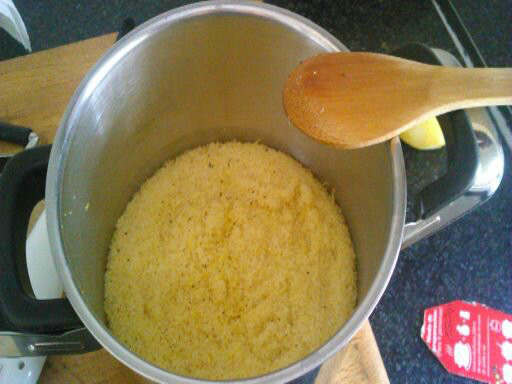 - Ya tenemos el cuscús, pegado, añadimos una cucharada de aceite de oliva (o mantequilla) y removemos de abajo a arriba siempre, para ir soltando el grano, sin aplastarlo con suavidad; así, hasta soltarlo todo.