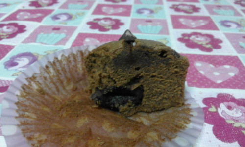 Precalentamos el horno a 200ºC y preparamos las cápsulas de papel para magdalenas en unas bandejas especiales para hacer magdalenas. Rellenamos las cápsulas hasta la mitad y a continuación ponemos una onza de chocolate en cada una, después la tapamos con un poco más del preparado.