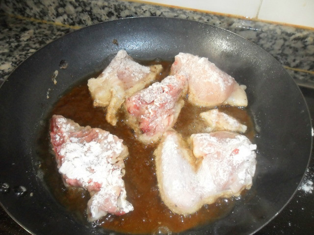 Partimos el pollo en trozos grandes y lo salpimentamos, lo freímos en aceite un poco fuerte y reservamos.