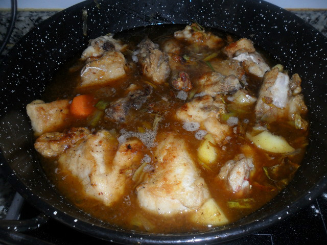 En el mismo aceite freímos el puerro, la zanahoria, los ajos y las manzanas, agregamos el pollo y el laurel, lo cubrimos con agua y dejamos hervir hasta que el pollo este tierno.