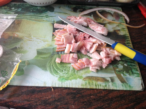 poner en una cazuela la cucharada de aceite de oliva y de mientras partir el beicon en trocitos pequeños, echar estos en la cazuela y remover