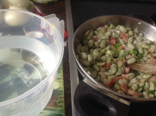cuando la cebolleta está pochada, añadir las habas sin dejar de remover durante 5 minutos , cubrirlas con agua y cuando hierben mantener durante 30 minutos a fuego medio , sacar y servir