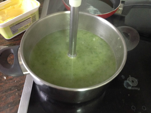 en un cazo, poner la mantequilla, echarle la maizena y mezclar, añadir el vaso de leche y remover bien hasta conseguir una crema tipo besamel ligera