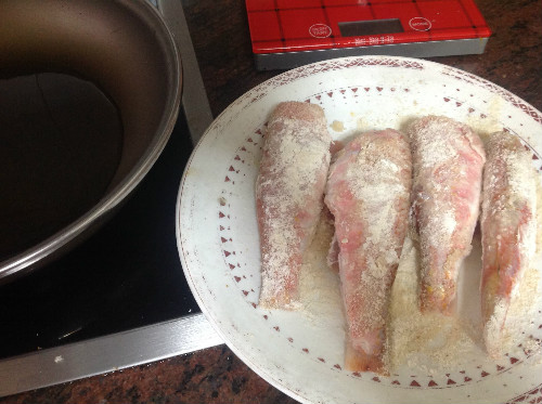 poner una sartén al fuego con aceite de oliva y de mientras una vez limpios y escurridos los salmonetes, pasarlos por harina