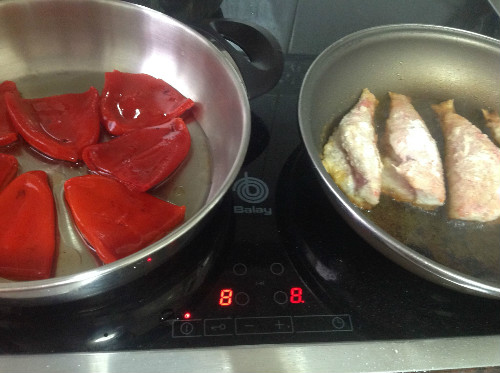 mientras se frien los salmonetes, en otra cazuela se ponen los pientos rojos del piquillo, en conserva se sofrien un minuto y se dan la vuelta, se añaden los ajos y la cebolla y se baja el fuego. Se sacan los salmonetes a un plato y se reservan