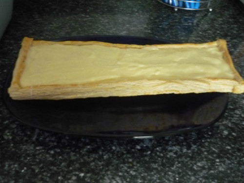 Precalentar el horno a 180º. Cortar la lámina de hojaldre a lo largo, estirarla. Cortar el sobrante en tiras e ir colocando en los bordes. Pinchar el centro para que no suba.