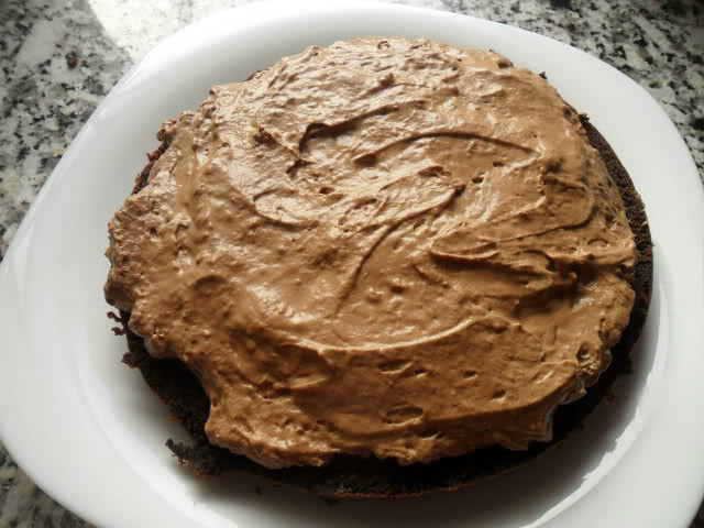 Añadimos un tercio de la mousse de cholate sobre una lámina del bizcocho, Tapamos con la segunda lámina de bizcocho y echamos el resto de la mousse de chocolate y lo dejamos lo más liso posible, lo metemos al congelador durante dos horas.