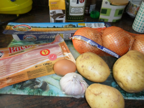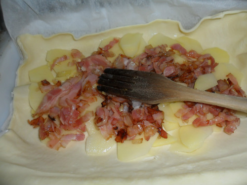 estender la masa en una fuente apta para horno, pinchar con el tenedor la base, colocar encima la mitad de las patatas y encima de estas el bacón, cubrir con el resto de patatas,añadirle el brik de nata, tapar con la masa de hojaldre,