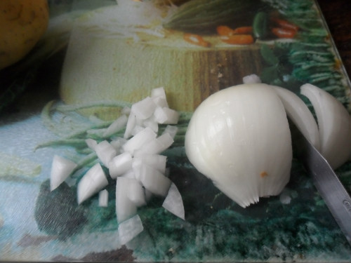 encender el horno a 200º, mientras coger el cuarto de cebolla y picarlo