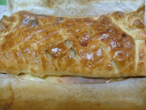 con la punta de un cuchillo hacerle unos cortes a la masa, batir el huevo y con ayuda de una brocha pintar la empanada, meterla a horno durante 45 minutos, observando a fín de que no se queme