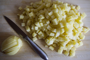 Cortar las patatas en cuadrados pequeños y freír en abundanta aceite caliente.