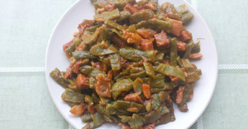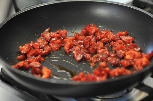Cortar el chorizo en trozos pequeños y sofreirlos en un chorrito de aceite. Añadir las judías y remover el conjunto unos minutos.