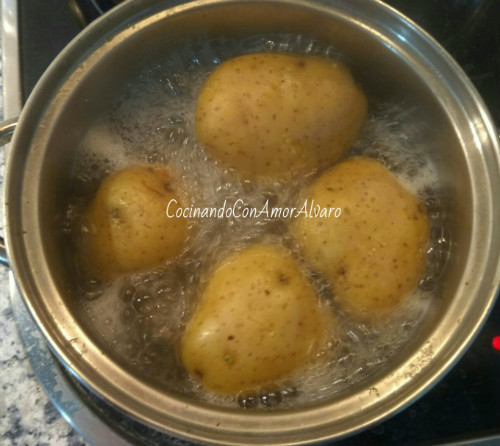Lo primero que vamos hacer será, cocer las patatas en una cacerola. La echando sal y las dejaremos que cuezan como 30 minutos.