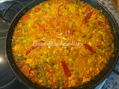 Por último, echamos las hebras de azafrán, y a continuación el agua. Debe de cubrir hasta los remaches de la paellera.