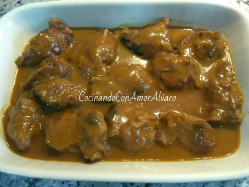 Sacamos la carrilleras de la Olla, y las ponemos en una fuente. Batimos la salsa con la batidora, y la volcamos por encima de las carrilleras.